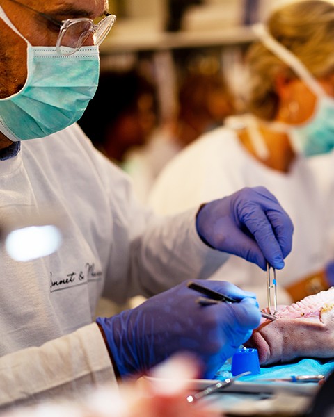 Tous nos cursus d’enseignements comportent des cours théoriques illustrés par des cas clinique traités dans nos pratiques quotidiennes, ainsi que des travaux pratiques vous permettant de réaliser concrètement les actes implantaires tant chirurgicaux que prothétiques, mais également des chirurgies en direct opérées par le docteur Franck Bonnet.